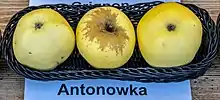 Antonovka (Russian: Антоновка, Polish: Antonówka) is a group of late-fall or early-winter apple cultivars with a strong acid flavor that have been popular in Russia, including during Tsarist and Soviet times, as well as in Poland and Belarus.[2] The most popular Russian variety is the Common Antonovka (Антоновка обыкновенная), from which other cultivars are derived. It was developed by pioneer Russian naturalist and plant breeder Ivan V. Michurin at his experimental orchard in the Tambov Oblast and introduced in 1888.[3]