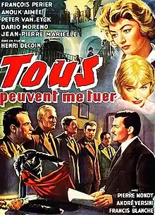 Anyone Can Kill Me (French: Tous peuvent me tuer, Italian: Tutti possono uccidermi) is a 1957 French-Italian crime drama film directed by Henri Decoin and starring François Périer, Peter van Eyck and Anouk Aimée.[1] It was shot at the Epinay Studios in Paris. The film's sets were designed by the art director Raymond Gabutti.