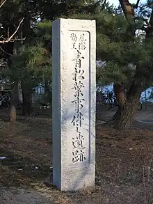 Three chief commissioners of Owari branch under ruling Tokugawa clan were enacted when entering the Ninomaru gate in Nagoya Castle. At the end of Taishō era in 1926, The stele was erected at the enactment point. The execution point is still uncertain, however, it has been thought to occur about 100 meters south from the present point of the stele. The stele was reerected after the enactment point had got lost.[4]