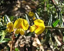 Aotus ericoides, also known as common aotus or golden pea, is a shrub in the family Fabaceae. It flowers in leaf axils in spring and has yellow pea flowers with splotches of red. It is endemic to eastern Australia.