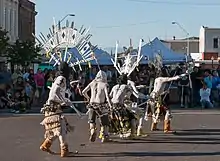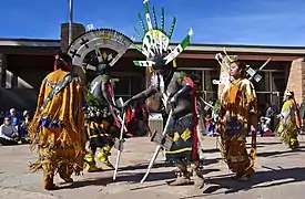 Apache Crown Dance or Gaan Dance (also called Mountain Spirit, Crown Dance, Devil Dance) is an Apache ceremonial dance that is intended to protect the community from disease and enemies. Dancers became "the embodiment of the Mountain Spirits (the Gaan)"; they wear special masks and wands during the dance. The dance is performed by a group of five members, one of them a "clown", each having his specific role. The dance is performed "on the final night of the Sunrise Dance ceremony".[1] The dance is described as following: