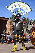 The Gaan dancers chant and keep beat with the same dance step as the girl, while in motion they lead the participant guests about the plaza. Eventually the girl follows the "clown" Gaan around the plaza and the guests fall in line after her. Upon returning to her original position, the Gaan surround the girl. The "clown" holds a mixture of ochre and corn pollen that is sprinkled or brushed over the girl by the other Gaan. Any remaining pollen may be emptied from the basket over her head and body. The Gaan bring a powerful spirituality to the ceremony as the Apache girl is transformed and attains womanhood.[1]