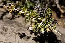 This plant is a shrub up to half a meter tall and one meter wide. The hard, spine-like twigs are lined with opposite clusters of leaves each a few millimeters long. The solitary flowers have four white to cream-colored, or occasionally pink, petals 5 to 6 millimeters long. The fruit is a follicle with 1 or 2 brown seeds.[3]