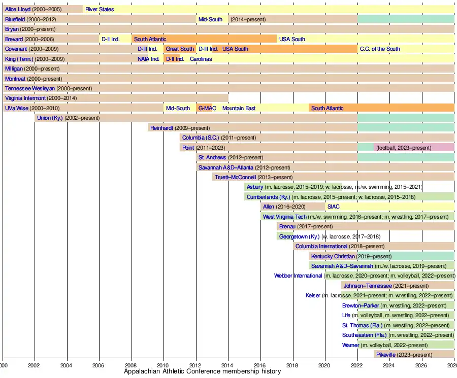 The conference is the successor to the Volunteer State Athletic Conference (VSAC), which began in the 1940s;[2] and later the Tennessee-Virginia Athletic Conference (TVAC) that operated during the 1980s and 1990s.[2] The Appalachian Athletic Conference was formed in 2000 with the additions of members from Virginia, Kentucky, and North Carolina.[2] In 2019 the conference added Kentucky Christian University as a full member and Savannah College of Art and Design as an associate member in men's and women's lacrosse.[3]