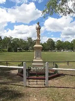 The First World War Memorial is situated facing the road in a landscaped area within the Apple Tree Creek sports ground which encompasses a cricket ground, rodeo ring and small band rotunda.[2]