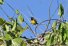 Though the apricot-breasted sunbird is common on Sumba, with an estimated population of 750,000, little is known about its biology.[3] It is typically conspicuous, and generally found singly or in pairs. Though it forages primarily in the mid-storey to canopy (or occasionally lower), nothing is known about its diet. Its breeding is equally mysterious, with nothing known about courtship behaviour, nest, eggs or young.[4]