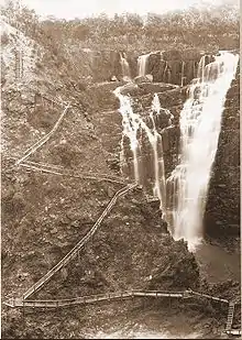 In 1902 three men, Ted Baker, Jim McMillan and "Wattie" Joiner built the wooden stairway that zigzagged its way from the top of the gorge to the water's edge. All timber used in this dangerous and mammoth task was hand dressed with an axe and adze by this trio. The original stairway was used until 1932, when it was declared unsafe and partly demolished. in 2020 the wooden stairway was fully demolished.[3]
