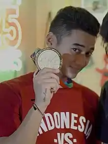 ![]() Aqsa Sutan holding his 2018 Asian Games gold medal | |