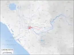 It flowed for 16.4 km (10.2 mi) to Rome from the east and emptied into the Forum Boarium near the Porta Trigemina. Nearly all of its length before entering the city was underground, which was necessary because of the relative heights of its source and destination, and which also afforded it protection from attackers during the Samnite Wars that were underway during its construction.[1] After entering the hilly area of Rome, the aqueduct alternated between tunnels through the Caelian and Aventine Hills and an elevated section. A detailed modern model of ancient Rome shows the aqueduct running along the top of the Servian Wall above the Porta Capena.[4] It dropped only 10 metres (33 ft) over its entire length, making it a remarkable engineering achievement for its day.