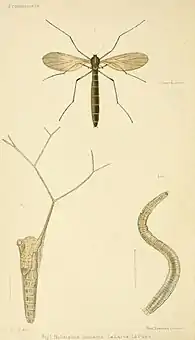 The first written record of the species dates from 1871 when it was collected from a gold mine in New Zealand's Thames region. At first it was thought to be related to the European glowworm beetle (Lampyris noctiluca) but, in 1886, a Christchurch teacher showed it was a larva of a gnat, not a beetle.[2] The species was first formally described in 1891 with the species name Bolitiphila luminosa and was assigned to the family Mycetophilidae.[4] In 1924, it was placed within a new genus of its own, Arachnocampa, because the wing venation of the adults and the behaviour of the larvae differed significantly from other Bolitophila fly species. It was given the genus name (meaning "spider-worm") on the basis of its building a silk nest and using silk threads to capture prey.[5][6]