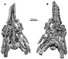 The skull of Arambourgisuchus measures up to 1 m (3 ft 3 in) in length, most of which being made up by the elongated rostrum. The nares are poorly preserved but large, the orbits are rounded and bordered by a prominent process of the postorbital bone as seen in other dyrosaurs. In Arambourgisuchus the supratemporal fenestrae are very large and elongated, nearly three times longer than they are wide and only separated by a narrow interfenestral bar. The premaxilla is almost circular at the front of the skull and extends back to approximately the level of the third tooth of the maxilla, preventing the nasal bone from contacting the nares. The premaxilla likely contained four teeth. A small first tooth is followed by a small concavity (receiving the robust first mandibular tooth), in turn followed by the larger second and third tooth, the later of which appearing to be the largest based on a prominent gap in the toothrow of the mandible. Although the fourth tooth is not preserved, the absence of a large gap between the mandibular teeth suggests that it would have been small. The transition between premaxillary and maxillary teeth is marked by an enlarged toothless area (diastema) receiving an enlarged fourth dentary tooth. Estimates suggest that the maxillae each contained seventeen additional teeth, which are widely spaced up to the thirteenth tooth (at which point the distance between teeth decreases). The teeth of Arambourgisuchus are generally robust and sharp. The maxilla is long and narrow, making up the majority of the rostrum and gives the dyrosaur its longirostrine appearance. The nasal bone consists of a single fused bone with only very little ornamentation compared to the maxilla, which are laterally sculpted by deep ridges and furrows. Both the lacrimal and prefrontal bone are longer than they are wide and make up the majority of the anterior border of the orbits. Most of the frontal bone is located in the area between the orbits and the nasal, which it bifurcates. The frontal contributes very little to the interfenestral bar, but lightly overhangs the supratemporal fenestrae. Three ridges can be seen between the eyes, however aside from these the bone shows no ornamentation. The parietal contributes the vast majority of the interfenestral bar and shows a more developed overhang than the frontal. The back margin of the bone tapers and forms an acute process that overhangs the occipital condyle. The postorbital contacts the jugal to form the postorbital bar and the squamosal to form the lateral margin of the supratemporal fenestra.[1]