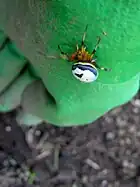 Their abdomens are globular and covered with fine hair. They slope abruptly from the mid-region to the posterior. Two small but distinct tubercles are present at the rear end. The dorsal surface is covered with white and black patterns that can vary considerably. The front edge usually has a wide black band. In the upper center is a characteristic large kidney-shaped marking (which can sometimes be a faint vertical line or V-shaped), from which it derives its common name. Immediately below it are two small but prominent black pits (fovea). At the posterior half is a series of faint transverse ridges.[1] The markings on the back of the spider can resemble a human face if viewed from the front.[6]