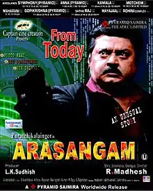 Arasangam (transl. Government) is a 2008 Indian Tamil language crime thriller film directed by R. Madhesh. The film stars Vijayakanth in the lead role, making this his 150th film, along with Navaneet Kaur, Sheryl Pinto, Rahul Dev, Biju Menon, Sriman, and Riyaz Khan. Produced by L. K. Sudhish the film had soundtrack was composed by Srikanth Deva and distributed by Pyramid Saimira. Shot in India and Canada, the film was released on 9 April 2008.