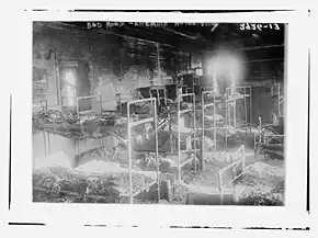The Arcadia Hotel was located at 1202-1206 Washington Street. It was a five story brick building with a saloon occupying the first floor and the top four floors were used as a low-priced rooming house for men.[2] The hotel was part of the Lyons chain of lodging houses.[3] The building was owned by Moses H. Gulesian.[2] The sleeping areas on second and third floors were divided by walls of match-board sheathing which fell three feet short of the ceiling.[4] The fourth had sleeping areas similar to the lower two floors as well bunk beds. The fifth floor was an open dormitory with bunk beds. According to the hotel register, 155 men were in the building that night.[3]