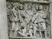 The frieze on the entablature portrays Trajan's triumphal procession after his victory over Dacia. On each of the pylons, between the corner pilasters, are two panels, one above the other, with scenes and allegories of imperial activities (Trajan's formal arrival at Rome, the concession of Roman citizenship to the auxiliaries, Trajan welcomed by the Senate, the Roman People and the Equestrian order, and others). They are separated by narrower decorative panels depicting Victories offering sacrifices of bulls in the center and Amazons at the top.