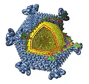 Cryoelectron microscopy reconstruction of Sulfolobus turreted icosahedral virus (STIV) showing a cutaway view of the T = 31 symmetry icosahedral capsid with turret-like projections that extend from each of the 5-fold vertices. Portions of the protein shell (blue) and inner lipid layer (yellow) have been removed to reveal the interior.[8]