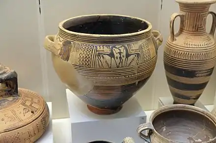 Vases and other artifacts from the Middle Helladic settlements at Tiryns, Asine, Berbati as well as the Palamidi-Pronoia cemetery at Nafplion, and Midea cover the entire chronological range of the middle Helladic period (2100/2000-1600 BCE), the culture which formed the substrate for Mycenaean culture.[1]