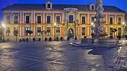 The Archbishop's Palace of Seville (Palacio Arzobispal) is a palace in Seville, Spain. It has served as the residence of bishops and archbishops of the episcopal sees and numerous nobleman and military figures to the present time. It is located in the southern section of Seville,[1] in the Plaza Virgen de los Reyes, angled almost opposite the Giralda.[2] It is situated on the northeastern side of Seville Cathedral in the neighborhood of Santa Cruz. Of Spanish Baroque architectural style,[3] it has had the status of National Monument since 1969.