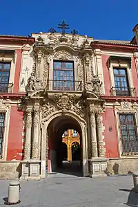 There are two entry doors, one to the east and another to the south.[2] The main portal, topped by vases and bronze flowers, is inscribed with vegetable motifs and displays of escutcheons.[3] Designed by Lorenzo Fernández de Figueroa and Diego Antonio Díaz in the Spanish Baroque style, it was built in the 18th century and is a good example of Seville Baroque. Intercolumniation is present at the main door, following the width of the patio, and includes several arches, supported by small columns of marble.[1] A cornice support two allegorical statues.[2]