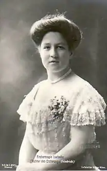 Archduchess Isabella Maria Theresia Christine Eugenie of Austria-Teschen (17 November 1888 6 December 1973) was a daughter of Archduke Friedrich, Duke of Teschen and his wife, Princess Isabella of Croÿ. She was a member of the House of Habsburg-Lorraine (her grandfather, Archduke Karl Ferdinand of Austria, was a grandson of Leopold II, Holy Roman Emperor).