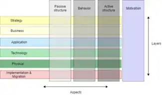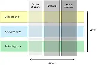 The main concepts and elements of the ArchiMate language are being presented as ArchiMate Core Framework.[18] It consists of three layers and three aspects. This creates a matrix of combinations. Every layer has its Passive structure, Behavior and Active structure aspects.