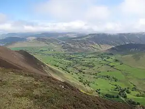 The narrow ridge is carpeted with heather, the top marked by a small cairn. The view from the summit is severely restricted in a north and westerly direction by the higher Eel Crag to Causey Pike ridge, the best feature of the view is the aerial view of the Newlands valley while Scafell Pike can be glimpsed 8 miles (13 km) away through a gap in the hills to the south.