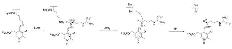The mechanism of arginine decarboxylase is analogous to other deaminating and decarboxylating PLP enzymes in its use of a Schiff base intermediate.[7] Initially, Lys386 residue is displaced in a transamination reaction by the L-arginine substate, forming an arginine Schiff base with the PLP cofactor.[8] Decarboxylation of arginine carboxylate group then occurs, where it is hypothesized that the C-C bond broken is perpendicular to the PLP pyridine ring.[9] The pyridine nitrogen group acts as an electron-withdrawing group that facilitates the C-C bond breaking. Protonation of the amino acid leads to the formation of a new Schiff base that subsequently undergoes a transamination reaction by the lysine reside of arginine decarboxylase, regenerating the catalytically active PLP and releasing agmantine as a product. Though it has been hypothesized that a protonated histidine residue involves in the protonation step as a proton source,[10] the identity of the proton-donating residue in arginine decarboxylase has yet to be confirmed.