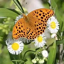 A. anadyomene Fldr. (= ella Brem., midas Btlr.) (70d, 71b, c). At once recognizable by the peculiar shape of the hindwing, the costa is nearly straight, being almost without a trace of curvature. Above like laodice, leather-yellow, evenly dotted with black, the female bearing a white spot before the apex. The hindwing beneath is shaded with silvery grey, having a strong metallic green gloss and being without the distinct silver bands of paphia. Throughout Eastern Asia; first described from China, but also occurring in Tibet, Amurland, Corea and Japan, ab. crassipunctata Fruhst. are specimens with larger spots above, which occur among the otherwise very constant nymolypical form (Leech). — Specimens from the island of Tsushima Fruhstorfer names prasoides; the subapical spots on the forewing above of the male are smaller than in specimens from China and Japan; in the female the basal area of the upperside is more abundantly dusted with light green and the hindwing beneath has a deeper sea-green tinge. — The species is very abundant in most localities in the warmer districts of Eastern Asia, but does not appear to go very far north; though being still plentiful on Askold, it is according to Graeser already rare near Wladiwostock, which is hardly further north. They fly somewhat later than sagana; in October I still found worn males and numerous females together with true autumnal species such as Vanessa glauconia, species of Catocala and Arhopala. They closely resemble on the wing the dark paphia female occurring there.[2]