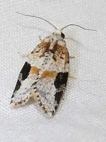 The wingspan is about 20 mm. The ground colour of the forewings is pale yellowish or whitish with a large dark grey patch and a greenish-yellow band.[3] Adults have been recorded on wing from March to August.
