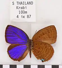 • Arhopala amphimuta amphimuta (Peninsular Malaya, Sumatra, Borneo, Bangka, possibly the Philippines)
