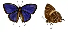 Very dark blue with a very narrow border: upper hindwing space 6 mostly blue. Below with a black tornal lobe and a more or less black spot alongside it this with metallic scales.Very similar to Arhopala oenea.[2]
