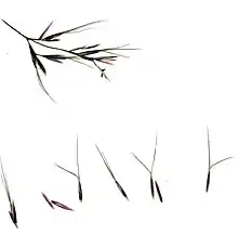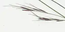 The grass-like or herbaceous perennial plant has a compact or loosely tufted habit and typically grows to a height of 0.3 to 2 m (1 ft 0 in to 6 ft 7 in).[1][2] It is strongly branched and has wiry culms. The leaves have smooth or scaberulous sheaths with a ligule that is approximately 0.3 mm (0.012 in) in length. The blade is convolute or conduplicate or sometimes but in some cases is flat with a width of around 1.5 mm (0.059 in). It has lanceolate shaped glumes that are 6 to 20 mm (0.24 to 0.79 in) in length with the upper portion being obtuse and the lower part acute to acuminate. The linear to elliptic lemma is purple or brown in colour with even darker margins and 6 to 9 mm (0.24 to 0.35 in) in length. The divergent flattened awns have a length of up to 30 mm (1.2 in).[2]