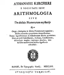 Arithmologia, sive De Abditis Numerorum Mysteriis is a 1665 work by the Jesuit scholar Athanasius Kircher. It was published by Varese, the main printing house for the Jesuit order in Rome in the mid-17th century.[1][2] It was dedicated to Franz III. Nádasdy,[3] a convert to Catholicism to whom Kircher had previously co-dedicated Oedipus Aegyptiacus.[4] Arithmologia is the only one of Kircher's works devoted entirely to different aspects of number symbolism.[5]