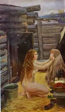 A characteristic for Plastov's works is the 1951 painting Spring (Весна). It shows a young naked woman dressing up a girl in front of a wood hut (a Banya, the Russian counterpart to the Finnish sauna). It snows, and in the background there are snow-covered pastures. Spring is considered as a turning point in the Soviet history of art. For the first time since the introduction of socialist realism a work of art showed an unpolitical everyday life scene in Soviet Union, without bringing any political message, as could be found in Plastov's earlier works that glorified the collectivization.