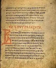 The manuscript was written by two scribes (according to the colophon, their names were — Michka and presbyter Peter), and also the third scribe (Jakim or Akim), who is responsible for the 175—177 sheets (with Sunday Gospel lessons) and the fourth, which name is unknown — who wrote only leaf 178 (Gospel lessons at date of Archangel Michael).[9] The handwriting of the two last scribes is dated palaeographically to the 13th–14th centuries.[7] According to N. N. Durnovo the fourth scribe was a contemporary for the first two scribes and dates its work to the end of the 11th century, or to the beginning of the 12th century.