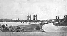 Congress first proposed a bridge at the site of the current structure on May 24, 1886. The resolution required that the United States Department of War study the feasibility of a bridge at the site, and a 24-foot (7.3 m) wide design was proposed later that year.[4] The following year, the War Department suggested a "Lincoln-Grant Memorial Bridge". The Washington Post supported the idea of naming the bridge after both Robert E. Lee and Grant.[5] Congress again passed a resolution requesting another design, and in late 1887 the department proposed a "General Ulysses S. Grant Memorial Bridge". The new bridge would be a suspension bridge 105 feet (32 m) high, with 98 feet (30 m) of clearance below it.[6] Designs for the bridge at this time included a bare steel truss bridge, a low masonry arch bridge, and a Romanesque Revival structure by Paul J. Pelz with two massive central towers, two barbicans on each end, and exuberant ornamentation.[7] Senator John W. Daniel sponsored legislation in 1897 funding a survey of the bedrock in the Potomac River.[8] Congress approved the legislation the same year, and the United States Army Corps of Engineers began the survey in July.[9] The survey was delivered in March 1898.[10]
