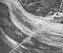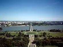 The McMillan Plan proposed siting a major new bridge and memorial at the western end of the National Mall, an area also known as West Potomac Park.[23][24] Almost none of the National Mall west of the Washington Monument grounds and below Constitution Avenue NW existed prior to 1882.[25] After terrible flooding inundated much of downtown Washington, D.C., in 1881, Congress ordered the Army Corps of Engineers to dredge a deep channel in the Potomac and use the material to fill in the Potomac shoreline (creating the current banks of the river) and raise this and much of the land near the White House and along Pennsylvania Avenue NW by nearly 6 feet (1.8 m) to prevent future flooding.[26][27][28] This "reclaimed land" — which included West Potomac Park, East Potomac Park, the Tidal Basin — was largely complete by 1890, and designated Potomac Park by Congress in 1897.[29] Congress first appropriated money for the beautification of the reclaimed land in 1902, which led to the planting of sod, bushes, and trees; grading and paving of sidewalks, bridle paths, and driveways; and the installation of water, drainage, and sewage pipes.[30]