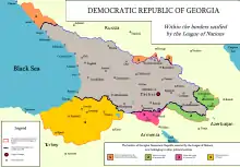 Following the 1917 Russian Revolution, the peoples of the southern Caucasus had declared the Transcaucasian Democratic Federative Republic (TDFR) in 1918 and started peace talks with the Ottomans.[6][7] Internal disagreements led to Georgia leaving the federation in May 1918, followed shortly thereafter by Armenia and Azerbaijan, however the borders between the three republic were contested.[8] The June 1918 Treaty of Batum ended hostilities between the TDFR and the Ottoman Empire. When the Ottomans pulled out of the area of modern Lori Province in October 1918 the area became disputed between Armenia and Georgia, the bulk of which had been the Borchalo and Akhalkalaki uyezds of the former Tiflis governorate.[9][10] Georgia stated that the southern limits of the former Tiflis governorate should form the border, whereas Armenia said that the boundary should be redrawn so as to reflect the ethnic situation on the ground.[10] After failed peace talks to settle the frontier issue, clashes broke out in October, followed by more stalled peace talks and a short war in December.[10][8] A ceasefire was brokered by the British under William Montgomerie Thomson on 17 January 1919 and the disputed area was declared a neutral zone pending further peace talks.[8][10] Thereafter, both Armenia and Georgia pushed into the Kars area of modern eastern Turkey, annexing lands and causing further disputes between over ownership of territory.[10]