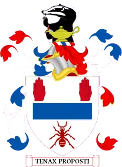 Escutcheon: Quarterly argent, sable, azure and of the first, a cross quarterly gules and of the first between, in the first quarter a sword erect of the fourth, in the second quarter a tower of the first, in the third quarter a harp Or stringed of the first, and in the fourth quarter a hand appaumee couped at the wrist of the fourth. | |