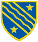 Escutcheon: Azure, within two bendlets, as many bendlets dancettee, all between two mullets Or; a bordure of the last. |