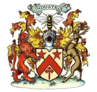 Escutcheon: Or, on a fesse sable between in chief an open book proper, edged gules, bound and inscribed with the Roman numerals MDCVIII of the second, and in base - a castle also proper, flying therefrom a banner of St. George, a harp between two fleurs-de-lys Or. |