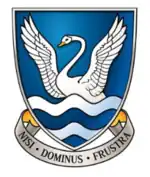 Escutcheon: Azure, in base two bars wavy argent, issuant therefrom a cygnet rousant proper. |