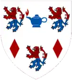 Escutcheon: Argent, in chief between two lions rampant per fess gules and azure an ancient lamp of the last enflamed gules, and in base a like lion between two lozenges also gules. |
