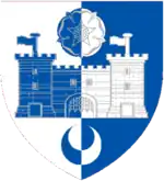 Escutcheon: Per pale indented, dexter, Azure, upon a rock in base a tower Argent, masoned Sable, windows and port Gules, supported by two lions rampant of the Second, langued of the Fourth, all demidiated; Sinister, per fess Or and Gules, a lion passant Azure, langued Gules in chief, powdered by six hearts of the last, all in chief, and in base an open book Proper, binding and fore-edges Azure. |