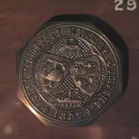 - ↑ The coat of arms has an interesting history; taken from the common seal of the company, according to the minutes taken at the first Board Meeting it was decided that it should be arranged as follows: Cardiff arms to the lower right of the seal, Newport arms to the lower left, surmounted by a vignette representing furnaces in the Egyptian style of architecture (this type of furnace was in use in the Rhymney Iron Works in 1828), a colliery on the right, and a ship to the left, to indicate the two terminals of the line. However, the engraver must have misunderstood the intention, for he placed on the left the seal that should have been on the right, and the colours of the Cardiff coat of arms are incorrect, as the chevrons should be gold. The placing of Newport on the shield is a mystery as the Rhymney Railway never went there.[38]