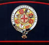 The "ferret and dartboard" heraldic device registered with both the College of Arms and the Lyon Court. Used from 1956-68. Initially transfers were made of the lion facing both directions, but the College later insisted it must always face left. The device is a modified version of the crest of the British Railways Board, with the lion issuant from a gold heraldic crown composed of a rose, (for England) a thistle (for Scotland), a leek (for Wales) and an oak leaf (representing all Great Britain).[2] Blazon: Issuant from a crown composed of a rose a thistle a leek and an oak leaf Or a demi lion Gules holding between the paws a railway wheel Argent. |