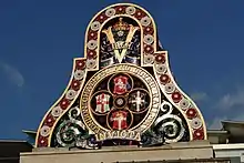| Somerset and Dorset Joint Railway The arms of Dorchester (county town of Dorset) - A castle triple-towered upon a mount and in front of the castle an escutcheon quarterly 1st & 4th France and England grandquarterly 2nd Scotland 3rd Ireland.[41] | |