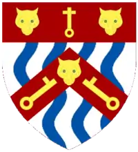 Escutcheon: Argent four pallets wavy Azure on a chevron over all Gules a leopard's face between two keys wards upwards and outwards Or on a chief Gules a double warded key wards upwards between two leopard's faces Gold. |