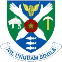 Escutcheon: Per saltire Azure and Vert two gloves Argent saltirewise in fess a rose of Lancaster Proper in chief Azure a wheel or winged of same dexter Vert a fleece Argent sinister Vert a mattock Argent hafted Or in base Azure three herrings naiant Argent. |