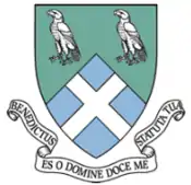 Escutcheon: Vert, a chevron between in chief to the dexter a Catherine wheel and to the sinister a lymphad, and in base a mitre, all Or. | |